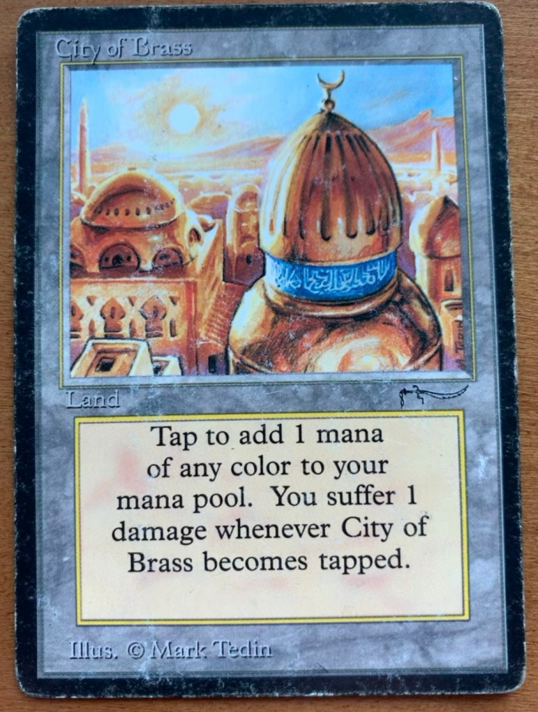 At n00bcon in 2024 I didn’t win a shark, but I had a very productive weekend playing Ante 40k. That weekend I returned to the Ante40k World Championship as a player rather than a scorekeeper. I lost in the finals to a very deserving Jonnie Myrbacka but over the course of the weekend I managed to win a City of Brass, Badlands, Moat, Unlimited Sol Ring, and Su-Chi. The alter that Mike Frantz did on the City of Brass I won from him was cool, but by virtue of his level of inebriation and the fact that we both wanted to get in as many games as possible in the Ante 40k World Championship it was rushed. When I got home I knew I wanted to do something to embellish it and make it my own because there was no way I wasn’t going to be playing that City of Brass in all of my decks going forward.