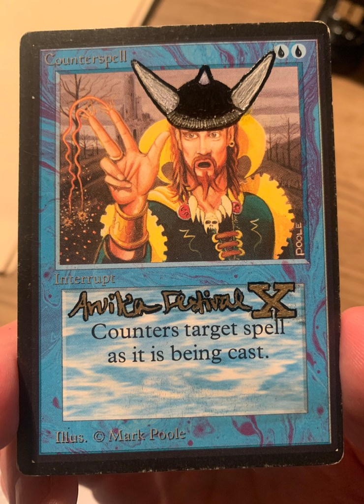 It was originally hastily altered in black sharpie by Mark Poole for me at MagicCon Philly 2023, then touched up by me afterwards, and then recently I decided I would make it into a card which I would bring to Arvika Festival 2025 to get signed by everyone. In the process of adding “Arvika Festival X” to the card, my OCD took the wheel. I decided to redo the alter completely to make it more to my liking which after about two hours of tinkering looks as it does now. In the process of outlining “Arvika Festival X” I managed to smudge the “M” in Mark Poole’s signature which led me to just remove it altogether with a dry erase marker. Now there is more space for player’s signatures which ultimately will make the card more personally significant to me than Mark Poole’s. It also helps that at this point it was me who did the visible alter, not Mark Poole. This Counter is a funny anecdote both about my OCD at work and my aesthetic preferences.