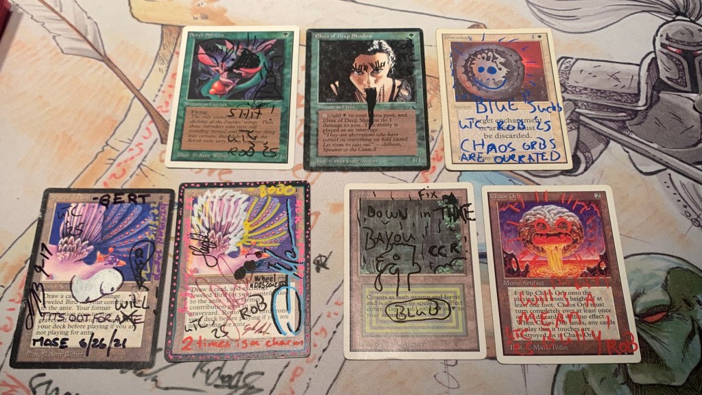 Slightly dismayed at losing four games in a row, Rob altered the cards he’d lost to me and I figured we were done playing. I think he did too until he realized that he had another deck that he’d yet to play against me. We shuffled up and played another game, with me winning a Disenchant at which point Rob realized that his deck had a proxied Chaos Orb in it.