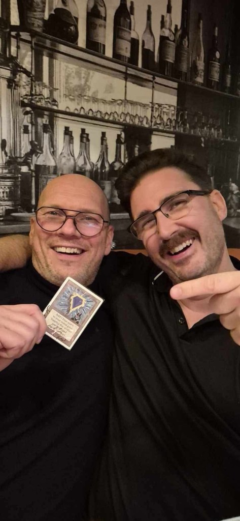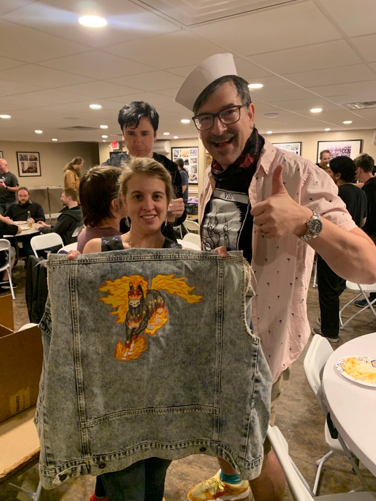 After the main event ended I was hanging out with Koos who offered to buy me dinner. Not loving the food at the venue, I graciously accepted his generous offer. While waiting to order, I complimented him on his Hurloon Minotaur jacket and he suggested that I try it on to see how it fits. He has a small and the sleeves were a bit short, but otherwise it fit really well. We agreed that a medium would be perfect for me, but also talk about how hard those employee jackets are to come by. I showed him a picture of Lucy’s unofficial Nightmare vest which she received as a gift from Reindeer at Lobstercon as a belated wedding gift and talked about how cool it would be if I had a jacket to match her vest.