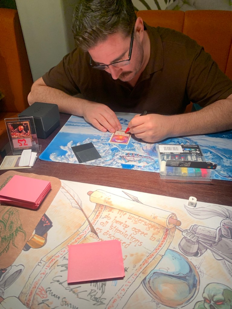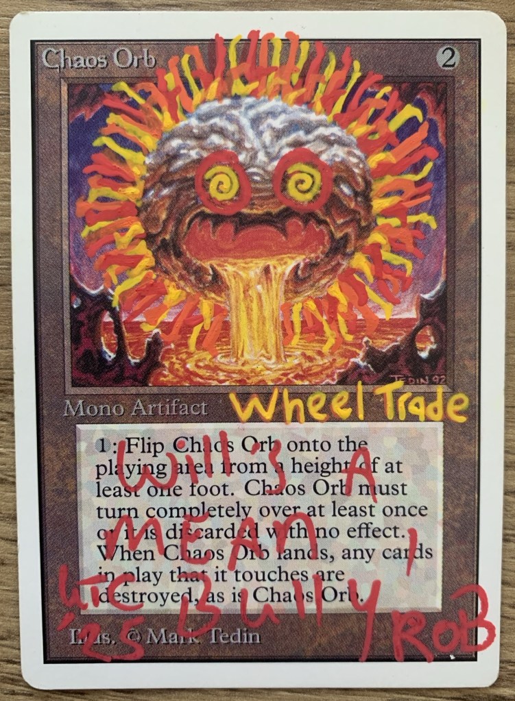 By current market prices, my trade offer was lopsided in Paul’s favor, but Ante40k trades are a weird niche because it is generally frowned upon to sell cards you win in ante. As a result, trades are much more in the “schoolyard trade from 1993” style where you’re trading one card won in ante for another. Both Wheel and Orb are chase rares so it seemed like a fair deal to me. Paul agreed to the trade and was OK with me touching up the Chaos Orb to add some vibrancy to it while staying in the spirit of Rob’s original alter.