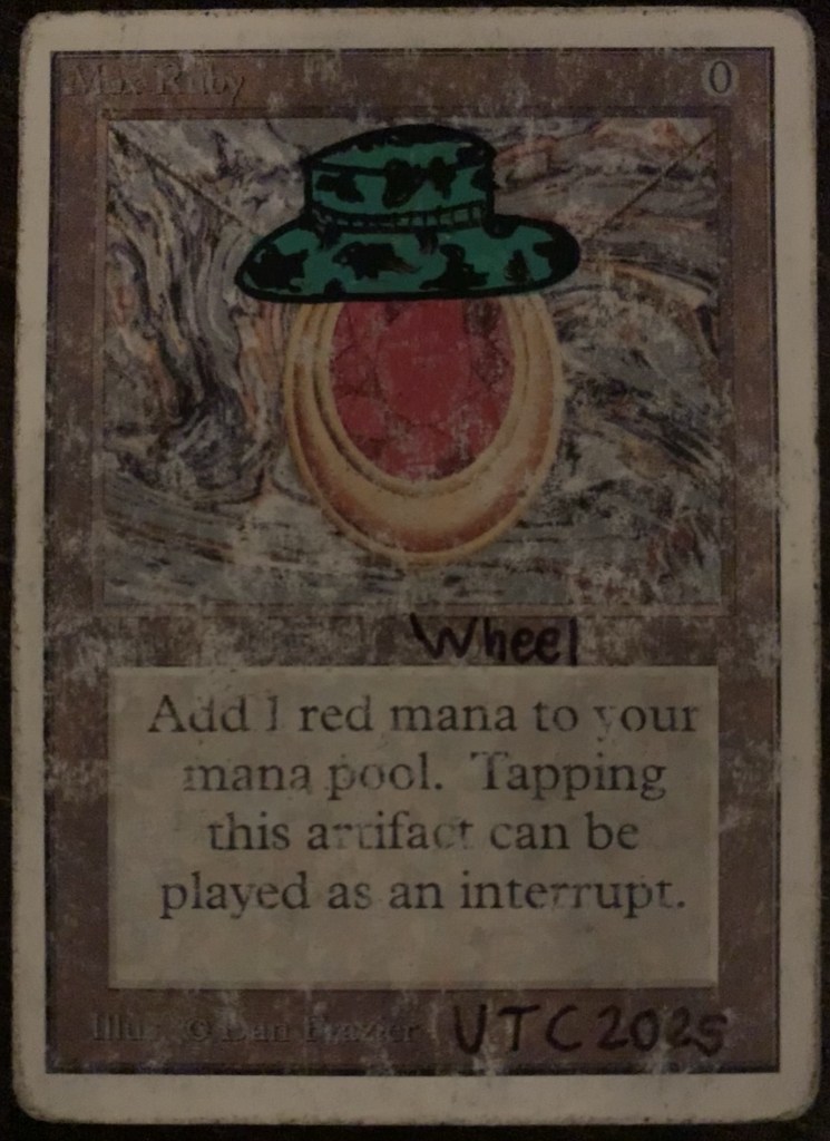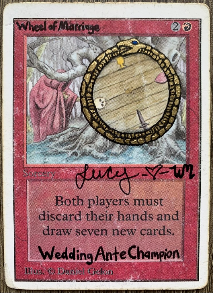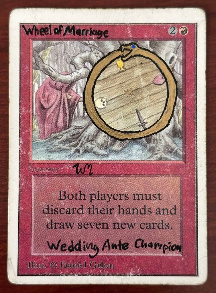 Before my wedding last summer, an argument could be made that my existing Wheel might have been the coolest out there. Daniel Gelon is not taking new commissions, and I’ve heard from friends that they’ve been waiting 2+ years for him to get alters back to them. Richard Garfield, the creator of Magic is not currently signing any new cards. As you can imagine, a Beta Wheel of Fortune that was both altered by Daniel Gelon and signed by Richard Garfield is highly sought after in, especially to the right person.