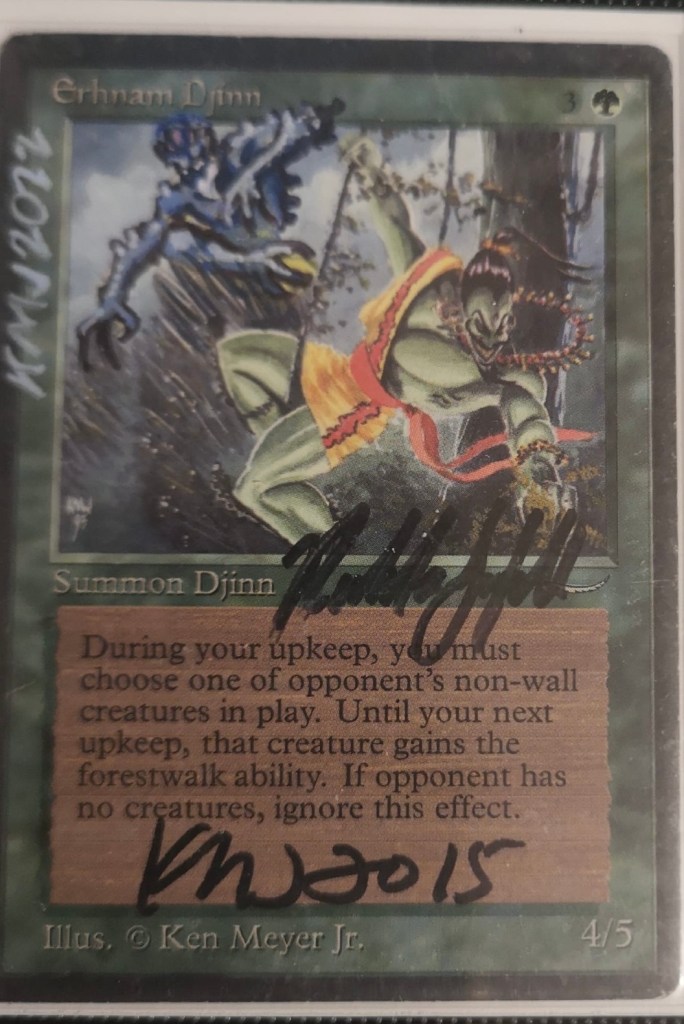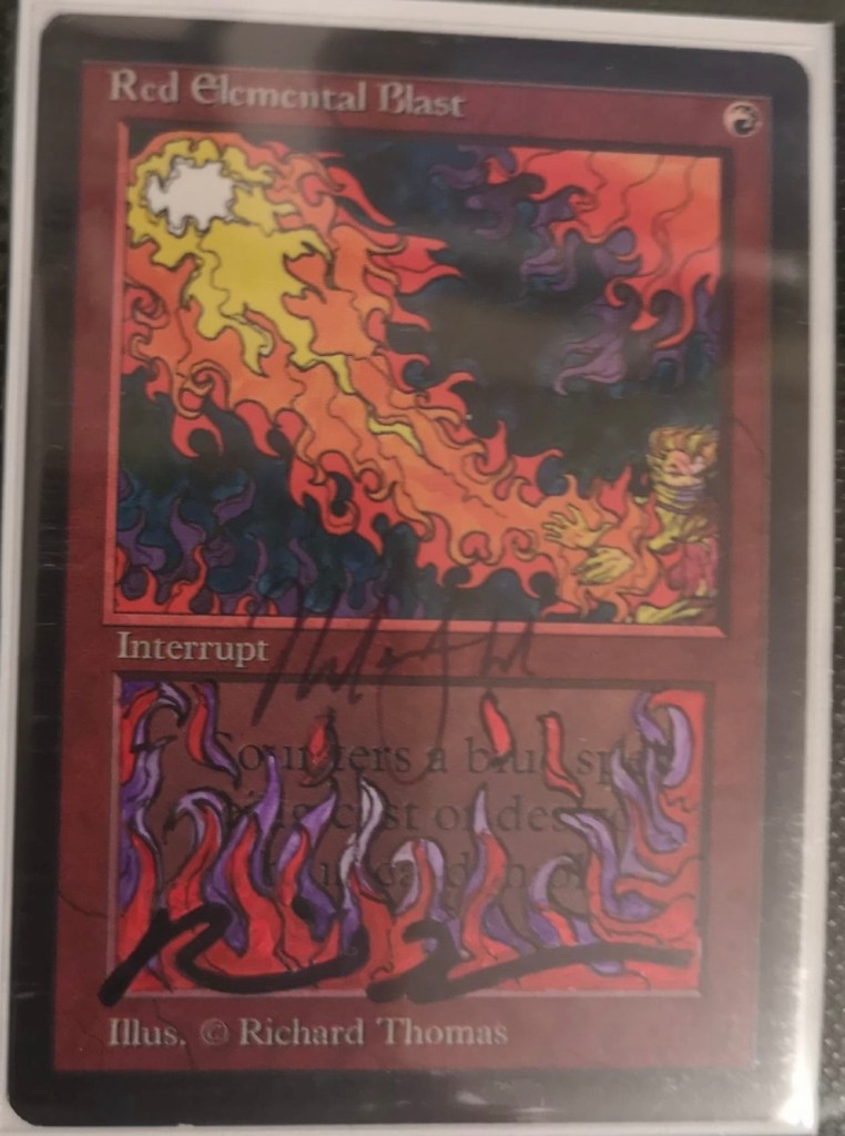 Other cards I was interested in were a double signed Tormod’s Crypt, a double signed and Richard Thomas altered Beta REB, and a pair of Anson altered Mazes of Ith. My Erhnam’s are just signed by KMJ so the upgrade there was obvious. I had recently acquired a Garfield signed Crypt, but Chris Rush is no longer with us and so a double signed one would be a clear upgrade for me. My REBs are a bit more subjective in terms of if they would be an upgrade as I have a personalized trio; one for the Brothers of Fire, Sisters of the Flame, and Bong Wraiths with signatures by members of the clubs. Still though, the alter was killer and I felt I couldn’t go wrong with having it in my collection.
