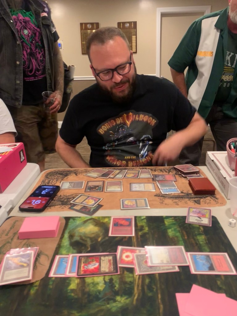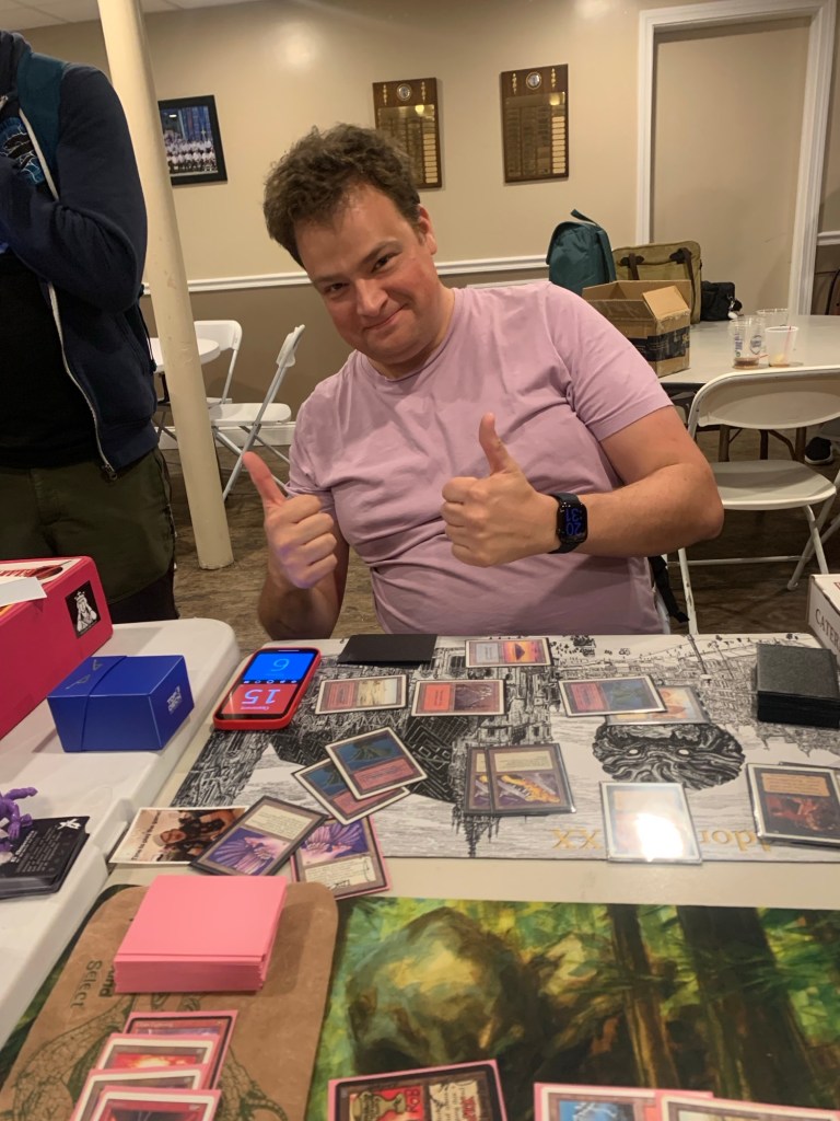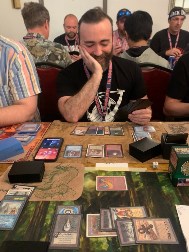 Round 4 saw me defeat Jay on Olle’s Dibatog list from Raging Bull. In game 2 I resolved a Braingeyser for 6 with BEB on his REB which allowed me to cast Mind Twist for hand and Shivan Dragon on the following turn which sealed it. In Round 5 I faced off against Matt in a The Deck mirror except he was on UWB with Sinkholes main and Hippy out of the SB. In Game 1 I had a turn 1 Library but no countermagic to stop him when he Mind Twisted me first for 3 and later for 3 more to take us both to parity. The Braingeyser he drew two turns later broke that parity and gave him the game. I got way ahead on life in Game 2 because Matt had 3 Cities of Brass, but struggled mightily to close the game. In hindsight I was probably being overly aggressive because I was down a game which can be a death sentence with The Deq. We had about 15 minutes left for Game 3 and for whatever reason I had it in my head that I needed to win outright rather than in Orb flips. I mulliganned to a weak 6 card hand that needed mana and a very specific hand from Matt to be successful. He had Turn 1 Lotus Hippy which my hand did not line up with and I succumbed quickly. In hindsight I should’ve boarded more defensively, but had I lost the game in Orb flips I would probably be singing a different tune.