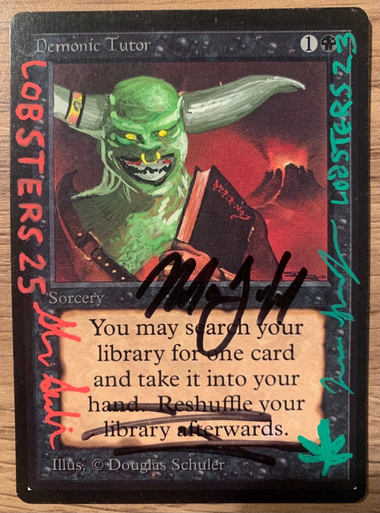 This card has been on quite the journey. Michelle Maggi got it signed by Richard Garfield and altered by Douglas Shuler and then sold it to Kalle who played it until he traded it to Schwartz as part of a deal to get his 4th Alpha Underground Sea. Schwartz being an ante legend decided to play it unsleeved in ante and lost it to Shawn at Lobstercon 2023.
