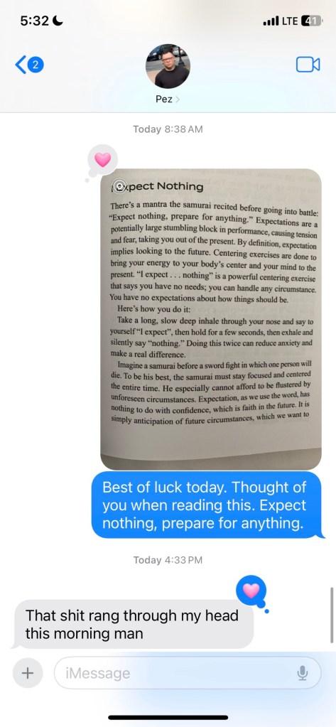 On Saturday I woke up and felt compelled to read a bit of the book I had brought with me, Inner Excellence. I shared a passage which made me think of Pez Unholy who I know shares an interest in personal growth and had made Top16. My hope was that this passage might be beneficial to him as he continued on his journey for greatness.